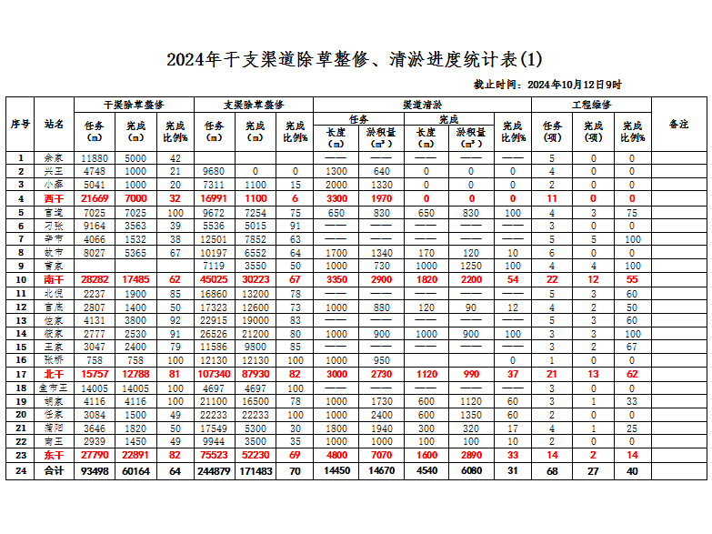 2024年干支渠道除草整修、清淤进度统计表(1)