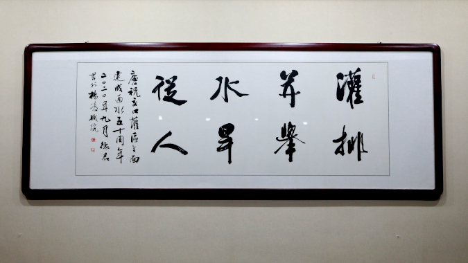这幅书法横幅作品是陕西农林职业技术大学书画艺术中心主任,中国书法家协会会员李德君老师的行书作品,于2020年9月,为庆祝交口抽渭灌区全面建成通水五十周年创作。现在悬挂于陕西省交口抽渭灌溉中心机关接待室。