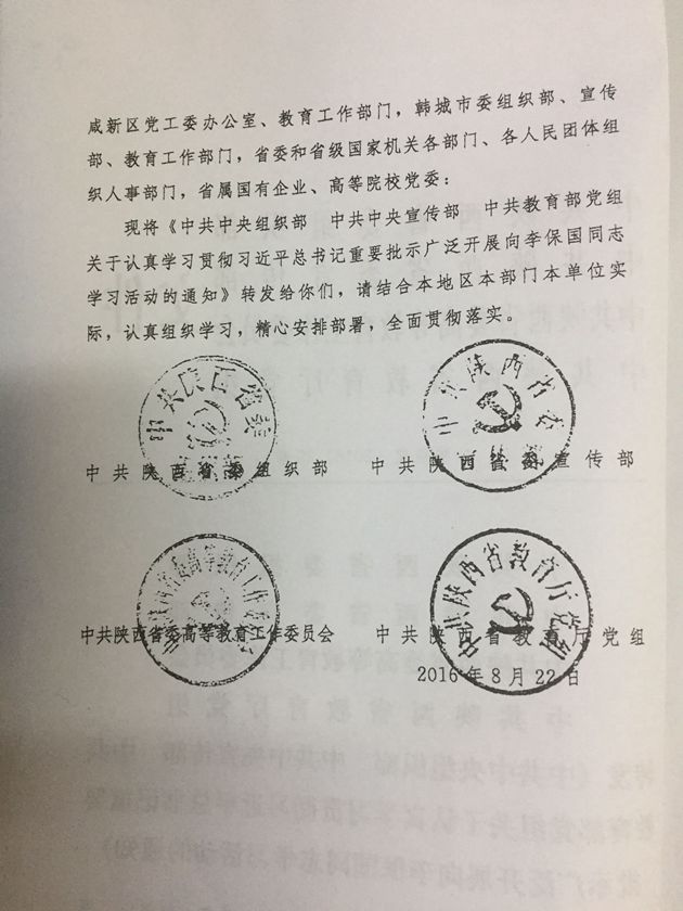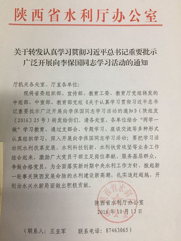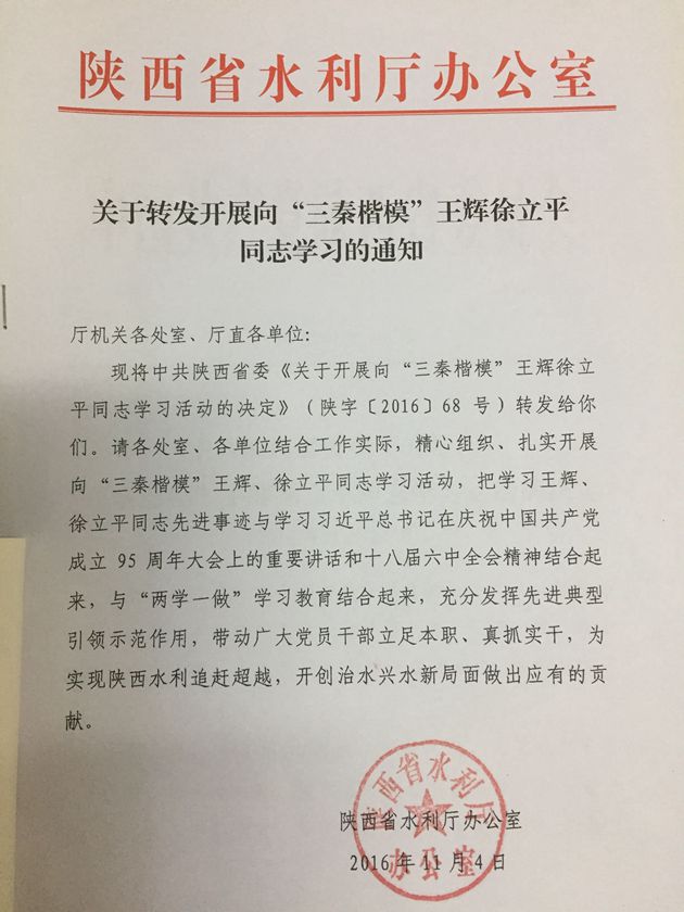 按照省水利厅统一要求,现将省委组织部、宣传部、教育工委、教育厅党组转发的中组部、中宣部、教育部党组《关于认真学习贯彻习近平总书记重要批示广泛开展向李保国同志学习活动的通知》(陕组发[2016]25号),中共陕西省委《关于开展向“三秦楷模”王辉徐立平同志学习活动的决定》(陕字[2016]68号)转发你们,请渭工局党总支、各党支部结合工作实际,精心组织,扎实开展好向三位同志学习活动。要充分利用网络、手机、报纸等媒体,采取支部组织学、个人自学等方式,迅速掀起学习热潮,营造浓厚氛围。要把向三位同志的先进事迹学习同十八届六中全会精神结合起来,同“两学一做”学习教育结合起来,激励广大干部职工爱岗敬业、扎根基层、钻研业务、勇于奉献的水利情怀,努力为实现灌区事业发展做出积极贡献。