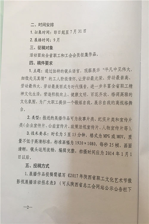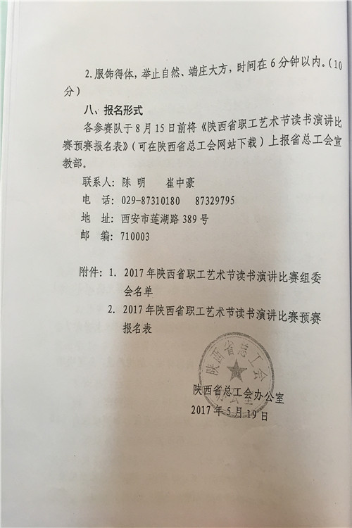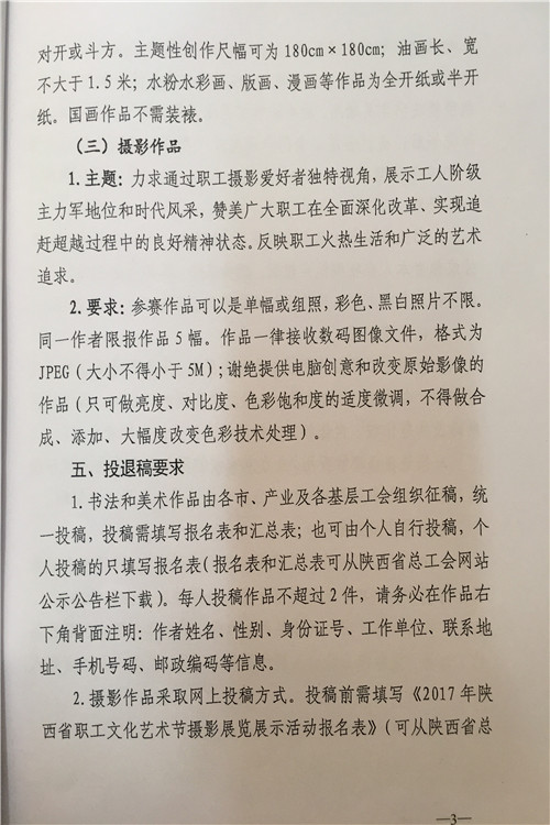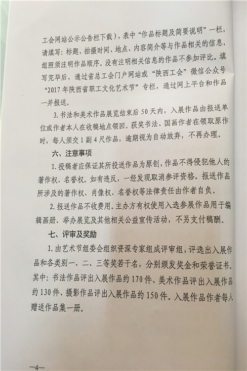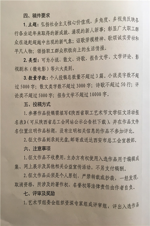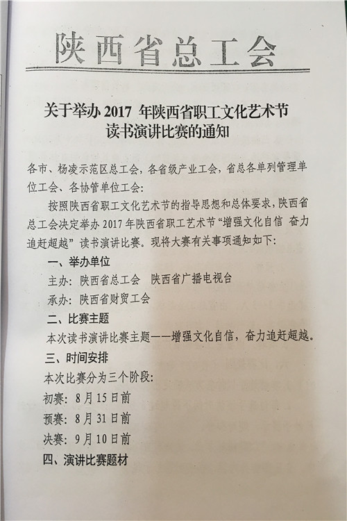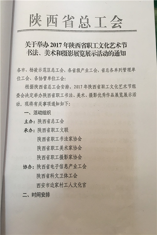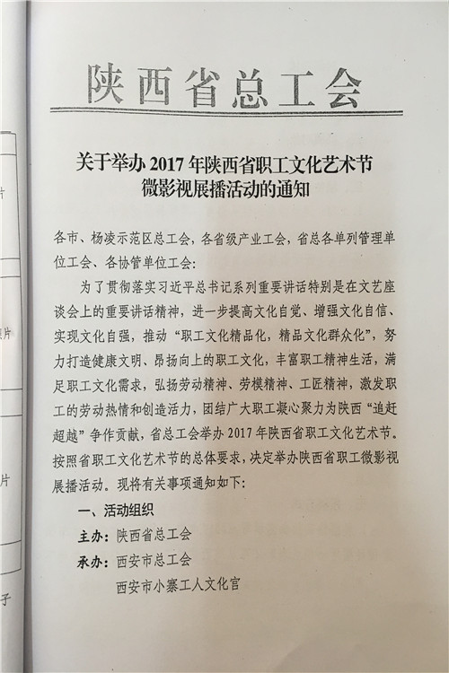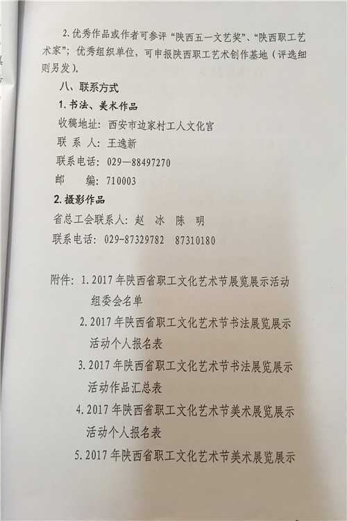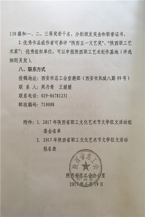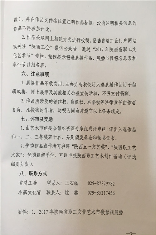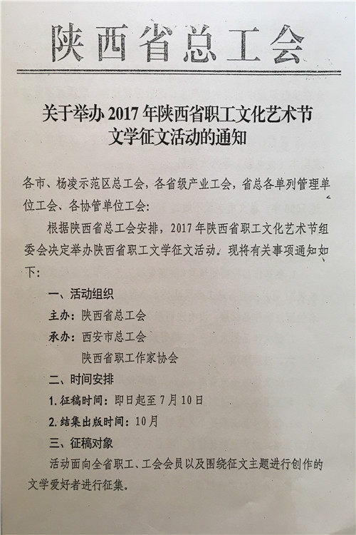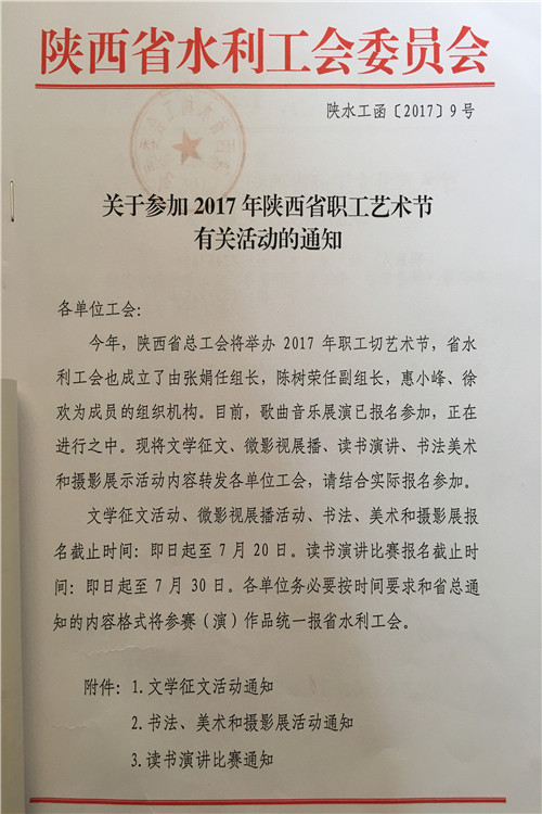 按照陕西省水利工会委员会《关于参加2017年陕西省职工艺术节有关活动的通知》(陕水工函2017〕9号文件要求,局工会文学征文、微影视展播活动、读书演讲、书法美术和摄影展活动内容转发你们,请全局广大爱好者积极报名参加,并将参赛作品及电子版报局工会办,报名截止时间为2017年7月18日联系人:孙红阁,联系电话:2185845。