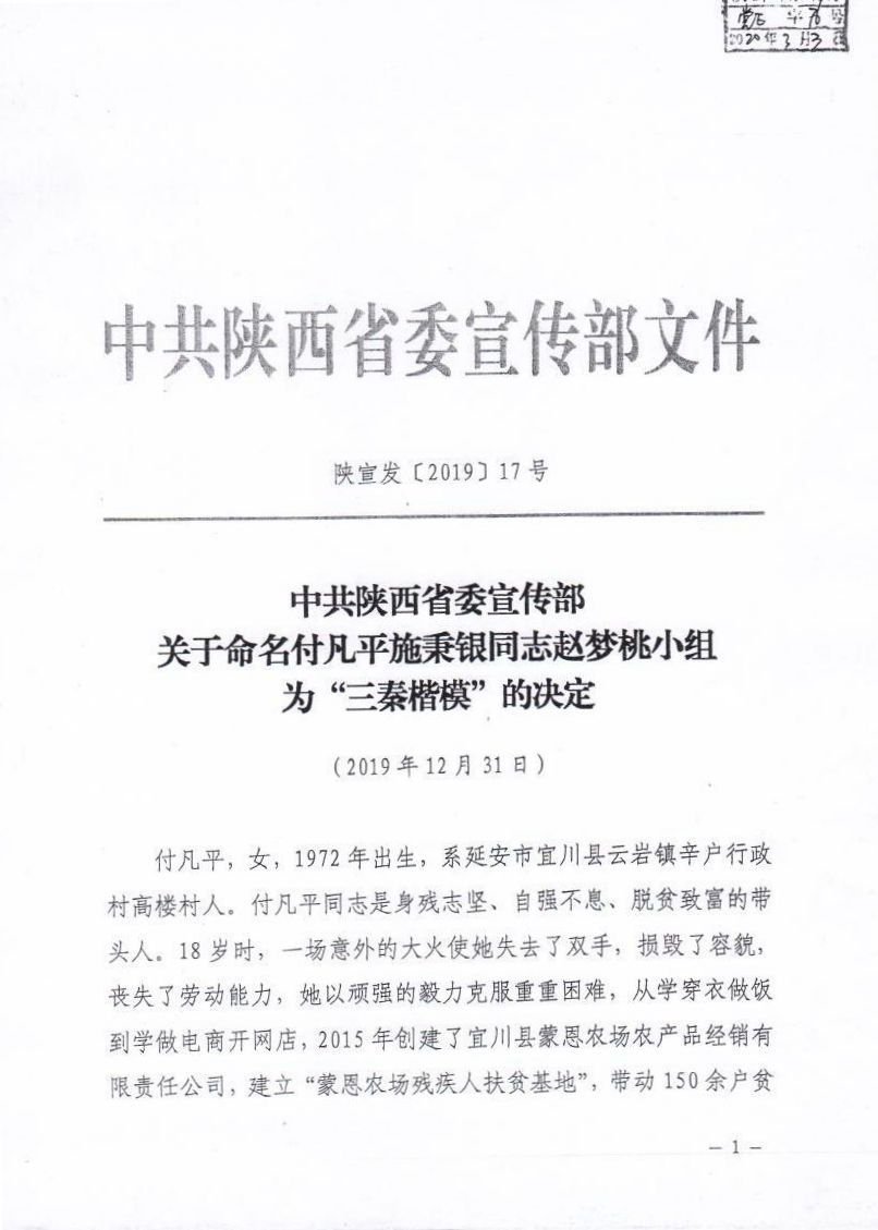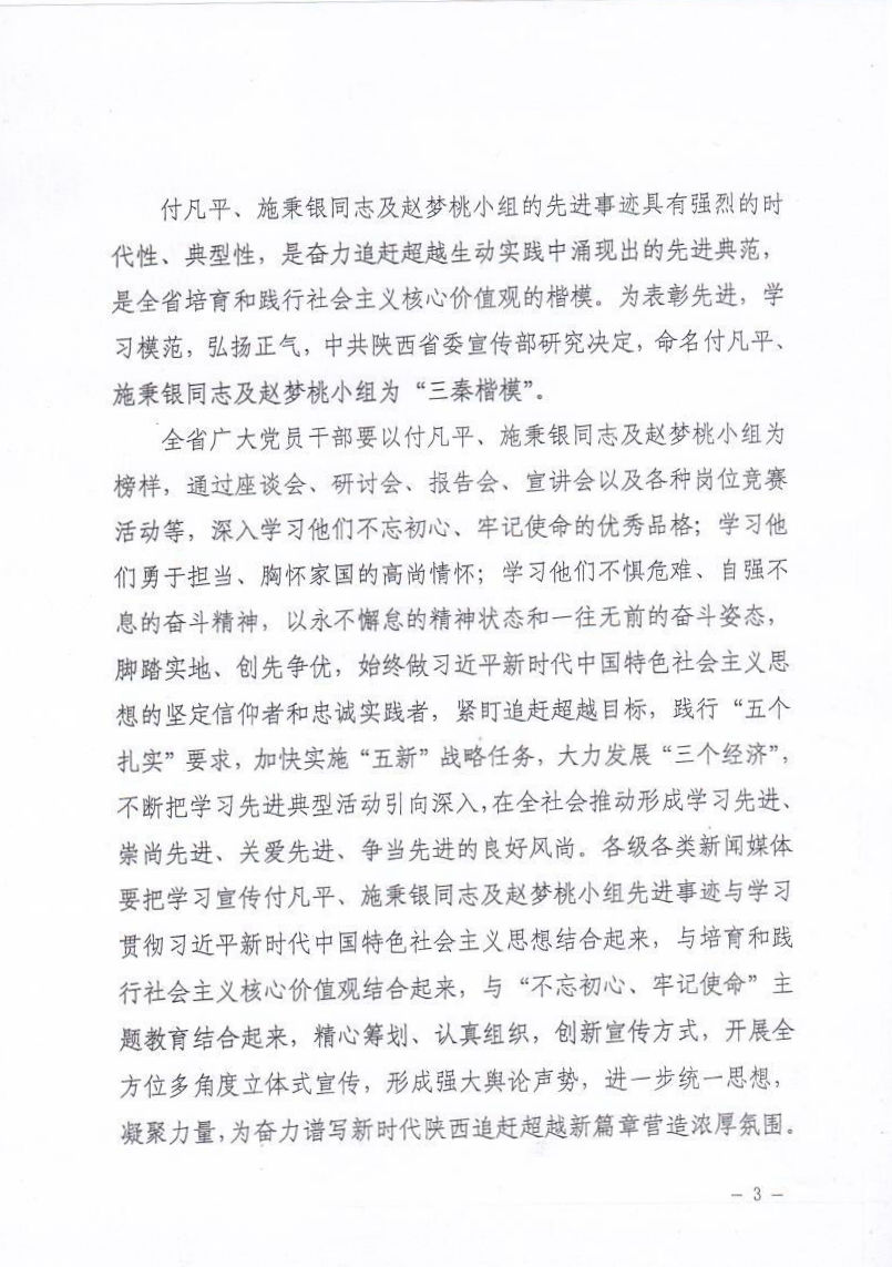 现将《中共陕西省委宣传部关于命名付凡平施秉银同志赵梦桃小组为“三秦楷模”的决定》(陕宣发【2019】17号)转发给你们,请根据通知精神,结合各自实际,抓好宣传学习。
